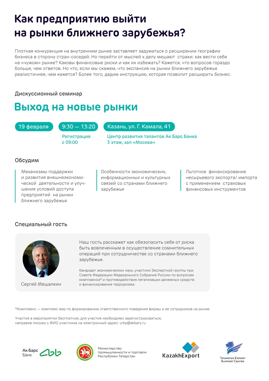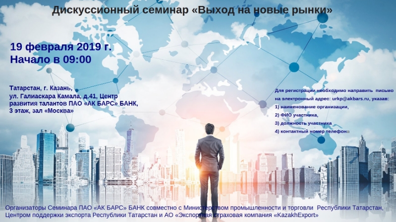 Полномочное представительство Республики Татарстан в Республике Казахстан приглашает Вас на дискуссионный семинар «Выход на новые рынки». Семинар посвящен механизмам поддержки и развития внешнеэкономической деятельности и улучшению условий доступа предприятий на рынки ближнего зарубежья:особенностиэкономических, информационных и культурных связей со странами ближнего зарубежья; меры и инструментыподдержки участников ВЭД, в том числе льготного финансирования несырьевого экспорта/ импорта с применением страховых финансовых инструментов. Организаторы Семинара: ПАО «АК БАРС» БАНК, Министерство промышленности и торговли Республики Татарстан, Центр поддержки экспорта Республики Татарстан и АО «Экспортная страховая компания «KazakhExport».