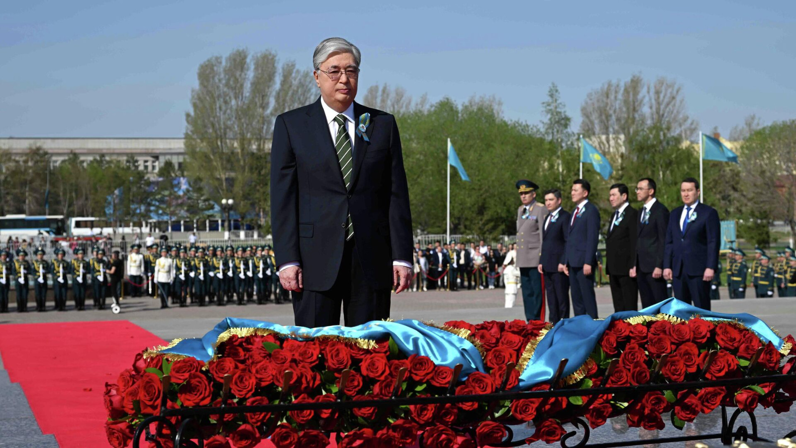 Сегодня Президент Республики Казахстан Касым- Жомарт Кемелевич Токаев возложил цветы к памятнику Отан Ана - Родина Мать и поздравил ветеранов войны, живущих в Казахстане. Более миллиона казахстанцев приняло участие в боях Великой Отечественной войны. Половина из них отдали за Победу свои жизни.
