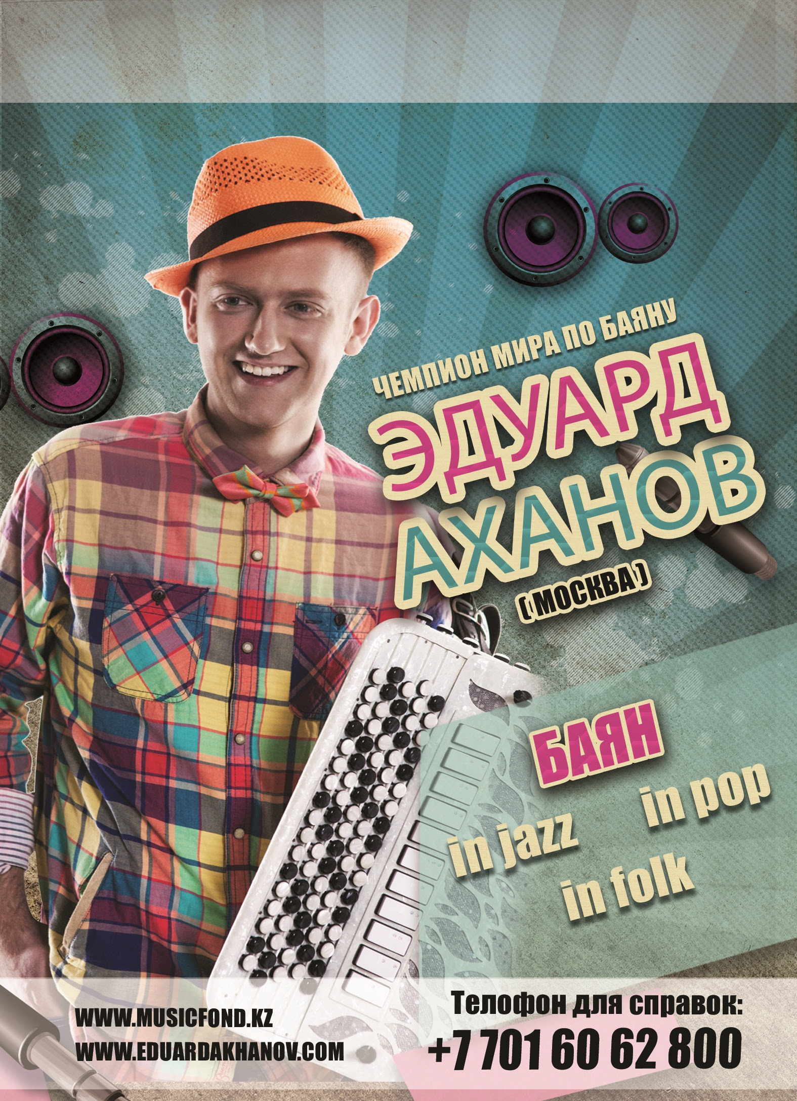 Эдуард Аханов – молодой талантливый баянист, лауреат международных конкурсов, постоянный участник проектов Творческой школы «Мастер-класс», широко известен в нашей стране и за рубежом как виртуозный исполнитель.