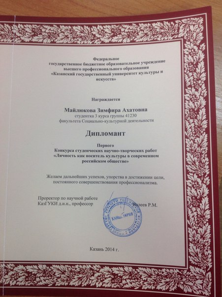 Студентка 3 курса Казанского государственного университета культуры и искусств - Зимфира Майлюкова была отмечена дипломом за лучшую работу в в конкурсе студенческих научно-творческих работ: "Личность, как носитель культуры в современном российском обществе", в которой рассказала о заслуженном деятеля Республики Казахстан, народного художника Республики Татарстан – Камиле Муллашеве.